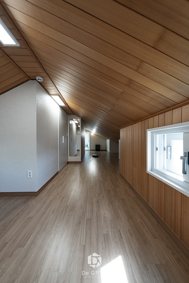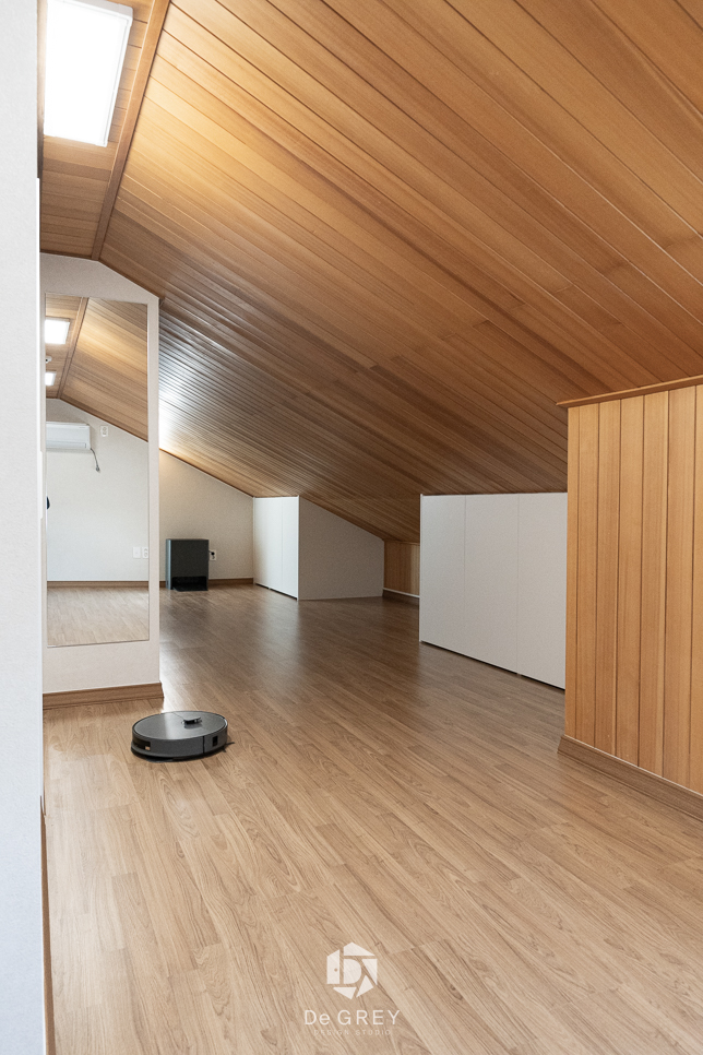 3층 다락방은 하나의 방으로 새롭게 개조해서 활용도를 높였습니다. 기존에 불필요했던 몰딩과 걸레받이를 최소화하고, 무몰딩·무걸레받이 시공으로 높은 층고의 시원함과 깔끔함을 더욱 돋보이게 했습니다.