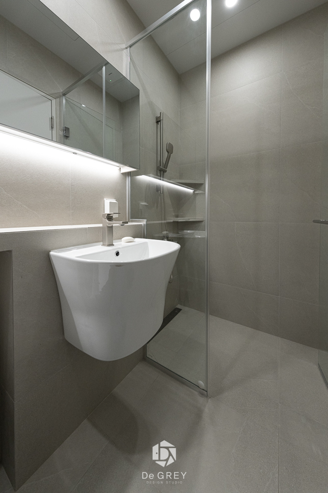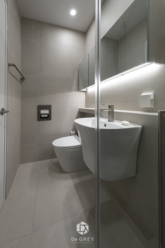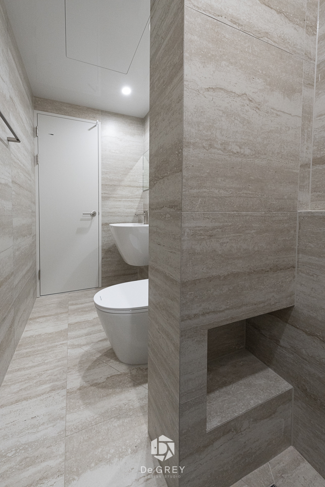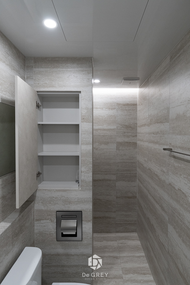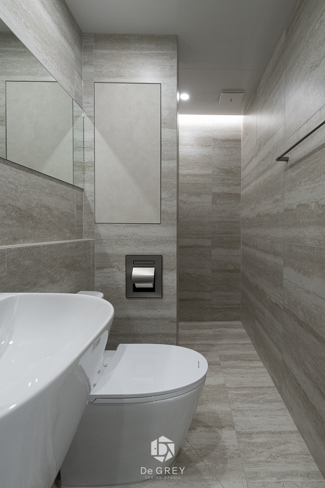 길고 좁은 욕실은 욕조를 과감히 제거하고, 길게 샤워부스를 조적으로 세워 공간을 효율적으로 활용했습니다. 휴지걸이와 수납장을 매립해 깔끔함을 더했으며, 세련된 포세린 타일로 호텔 같은 고급스러운 분위기를 완성했습니다.