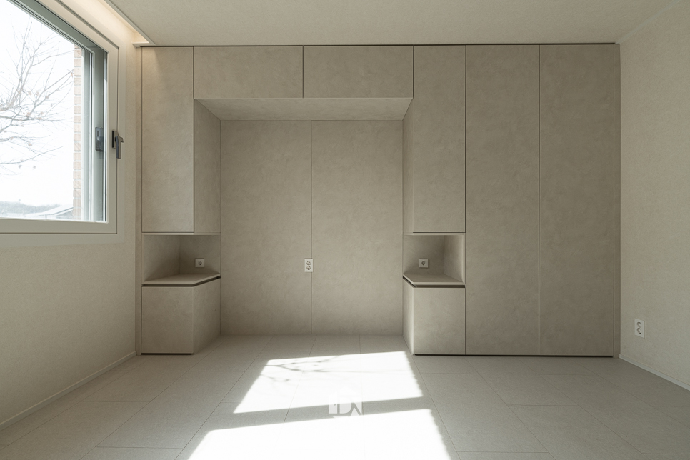 안방은 침대와 일체형 붙박이장을 제작해 좁은 공간에서도 수납력을 극대화했으며, 화장대도 공간에 딱 맞게 디자인해 실용성과 심플함을 동시에 잡았습니다. 아이방은 전체 가구를 맞춤 제작하여 아이가 성장해도 오래 사용할 수 있게 했어요.