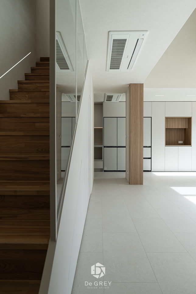 • 포인트: 계단 아래 빗각장, 각 방 맞춤 가구, 슬림 라인조명, 계단부 조명